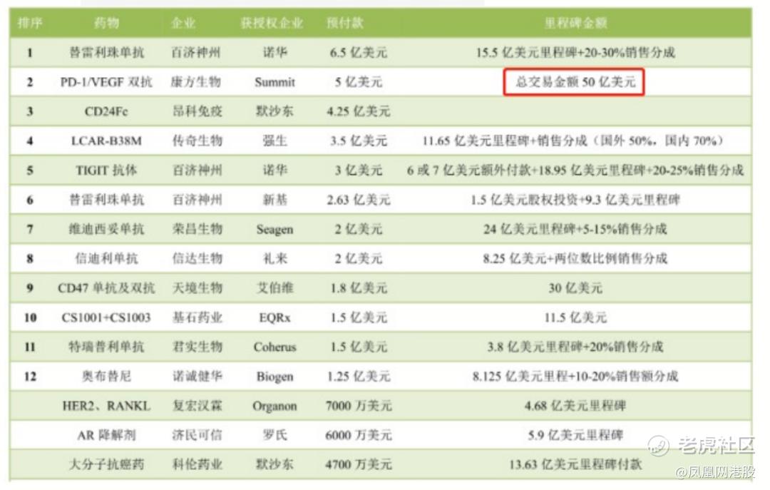 市场对于这笔交易反应剧烈,第二日盘前便打出一个43%涨幅的缺口,虽然之后有所回撤但之后几日的走势在市场整体走弱的情况下依然坚挺。市场的兴奋不是没有道理,康方的这笔交易打破了中国医药生物市场最高的海外授权里程碑记录。加上康方本身AK104未来12个月50亿销售指引的余温还在,在全球经济衰退的阴霾中依然领涨生物药板块,也给寒冬中的港股市场带来一丝温暖。