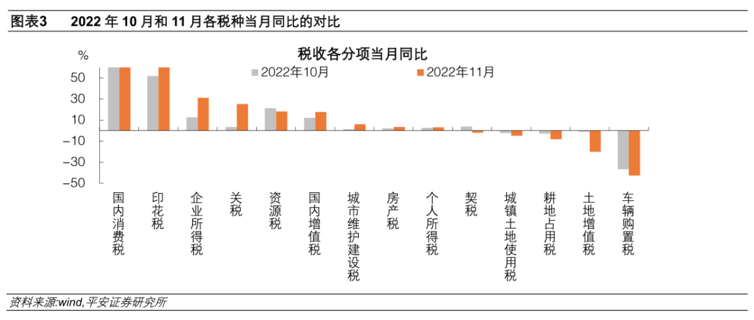 1)国内消费税延续高增,11月当月同比从上月的147.2%提高至156.8%。进入四季度后工业生产走弱(国内消费税主要在生产环节征收),但国内消费税收入连续两个月增幅超过1倍,原因可能是近期征收力度加大,前期未缴的在补缴。
