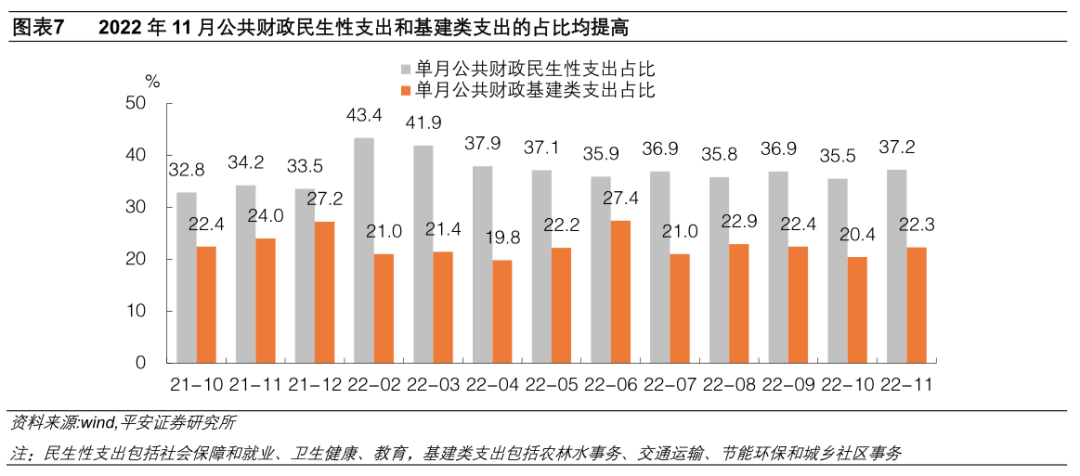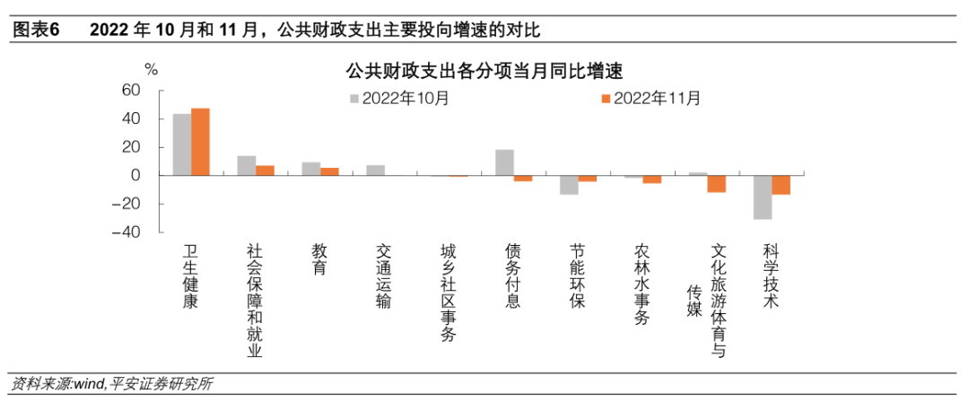 一是,今年11月农林水事务、交通运输、节能环保、城乡社区事务这四个和基建相关的支出分项(图表6),合计当月同比从上月的-0.9%下滑至-2.7%;