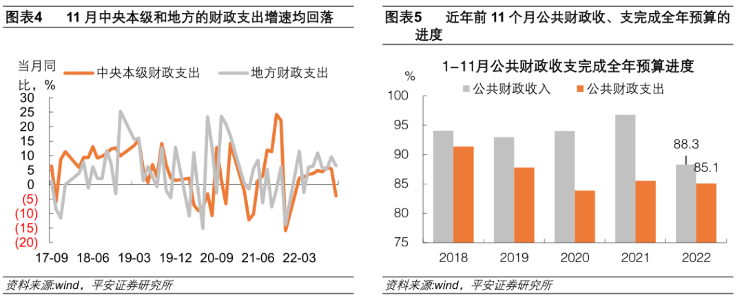 今年11月公共财政支出当月同比4.8%,低于10月的增速8.7%,可能原因是前期支出较快制约了年末的财政发力强度。分中央和地方两级政府看,中央一般公共预算本级支出当月同比增速从上月的5.5%下降至-3.9%,地方一般公共预算支出当月同比增速从上月的9.6%下降至6.5%(图表4)。