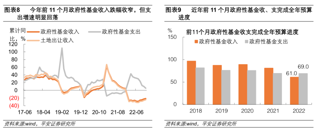 12月两本账支出增速有望回升。从当月同比看,今年11月政府性收入增速、支出增速和土地出让金收入增速均较上月的回落。我们测算得2022年两本账全年实际收入约为27.6万亿,比预算收入规模低3.3万亿。在调入资金规模不变的情况下,将5000亿专项债结存限额考虑进去,测算得12月两本账支出同比约为-0.8%,高于11月的增速-5.4%。因此,尽管公共财政支出12月增速可能延续回落,但在专项债结存限额资金的支撑下,预计12月公共财政+政府性基金两本账的支出增速将回升,这印证了我们前期认为9月(-10.0%)可能是今年两本账支出力度最弱月份的判断。