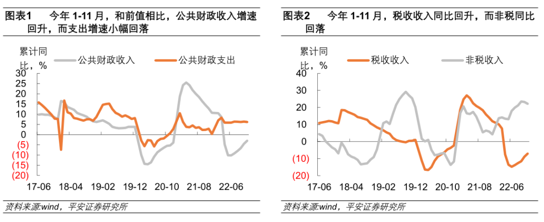2022年前11个月公共财政收入累计同比下降3.0%(图表1),高于今年前10个月-4.5%的增速,已连续五个月回升;扣除留抵退税因素影响后,今年前11个月公共财政收入同比增长6.1%,较前10个月的增速5.1%继续上升。公共财政收入11月单月同比24.6%,和10月的增速15.7%相比继续回升,且再创年内新高。