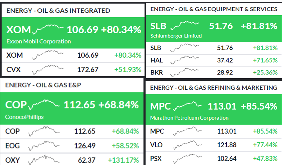 油气设备方面$斯伦贝谢(SLB)$ 上涨超81%,$哈里伯顿(HAL)$ 上涨超71%,油气勘探与生产方面,$康菲石油(COP)$ ,与$依欧格资源(EOG)$ ,分别录得超68%和58的涨幅。