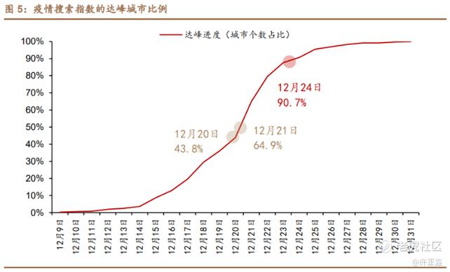 以百度疫情搜索指数来看(该指数大概包含356个城市,包括了直辖市、省会城市、地级市、州、盟、地区和少量省直管县,基本能反映全国的情况),12月21日有超六成(64.9%)的城市达峰,预计12月24日有九成(90.7%)的城市达峰,而元旦前后全国层面可能迎来人员流动的拐点。