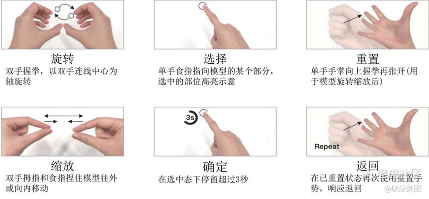HoloTable的显示结构为金字塔式,能够从四面椎体的不同角度观察三维物体的不同侧面,这种呈现形态非常适合多人沟通与交流。金字塔表面反射显示器画面带来的成像纵深感,让用户在视觉上感觉呈现的三维物**于金字塔的中心,从而带来一定程度的空间感与沉浸感。交互设计借鉴了人们在日常生活中操作真实三维物体的方式,采用虚拟手隐喻,在金字塔三维空间构建用户手的虚拟化身,对三维物体进行旋转、缩放、选择和重置等操作。如图所示,HoloTable系统设计并实现了一整套三维交互手势。