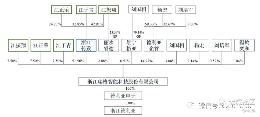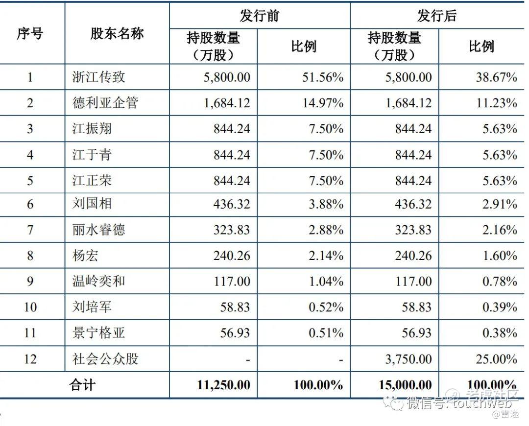 IPO后,浙江传致持股为38.67%,德利亚企管持股为11.23%,江振翔、江于青、江正荣分别持股为5.63%,刘国相持股为2.91%;