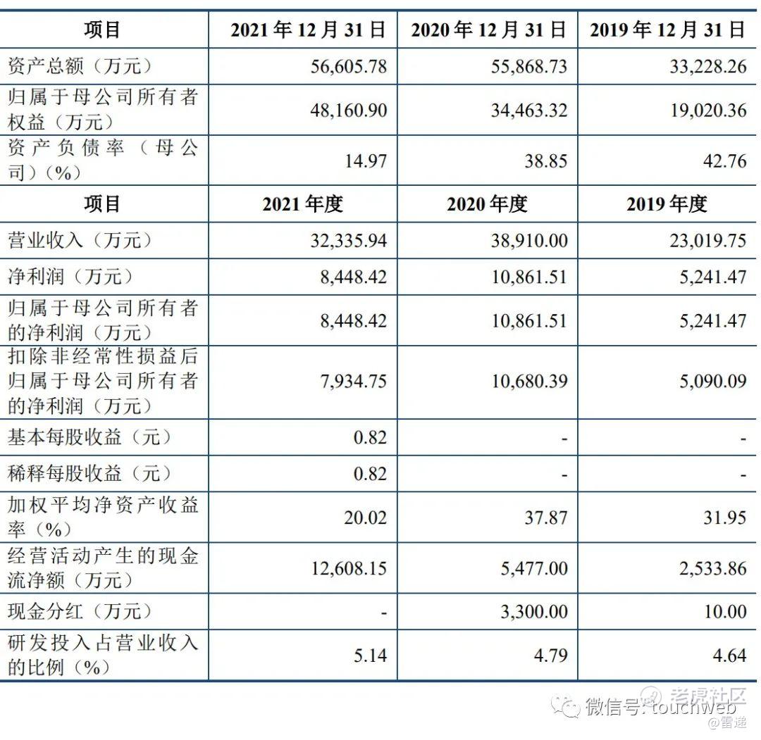 招股书显示,瑞格科技2019年、2020年、2021年营收分别为2.3亿元、3.89亿元、3.23亿元;净利分别为5241.47万元、1.09亿元、8448.4万元;扣非后净利分别为5090万元、1.07亿元、7934.75万元。