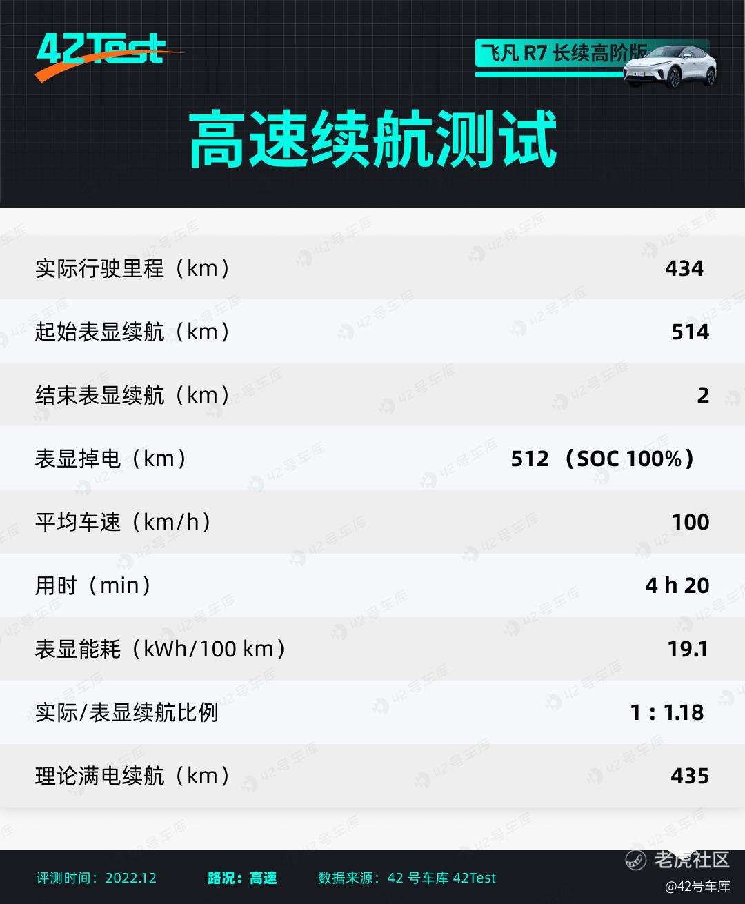 在气温即将跌破 10 °C 的上海,飞凡 R7 长续高阶版的高速续航一共是 434 km,冬季续航达成率为 67.6%。实际/表显续航比例为 1:1.18,是一个日常可信度非常高的参考值。