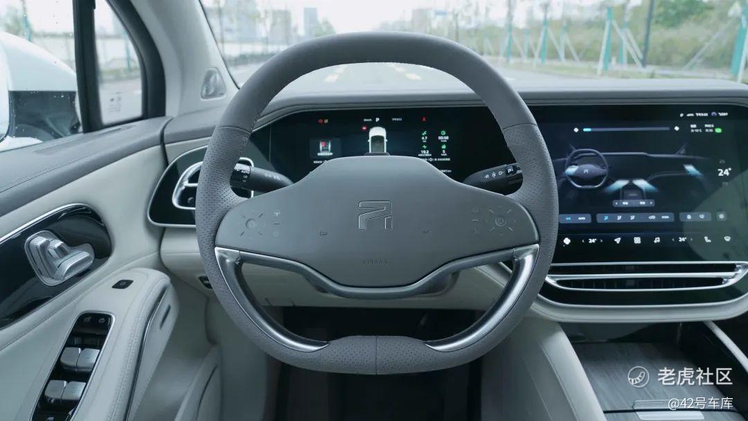 飞凡 R7 的方向盘造型争议比较大,观感上中间区域并没有做到上下对称。实际体验后 R7 方向盘的握持手感是比较饱满的,由于中间气囊盖的位置是凸起的,所以方向盘左右两侧的按键也是比较好操作的。唯一的问题可能是方向盘的样式需要习惯一下。