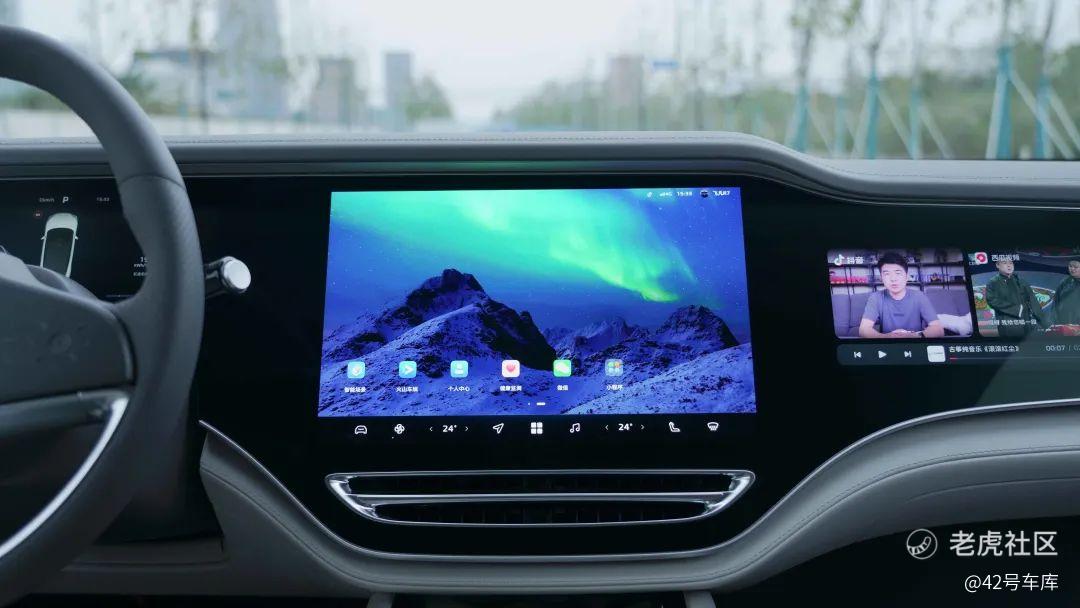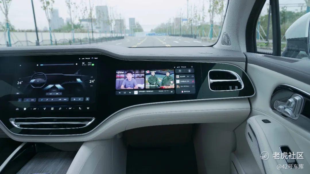 向右看就是 12.3 英寸的副驾屏,屏幕材料和仪表一样是 miniLED 材质,和 12.9 英寸的 iPad Pro 类似。可实现更精细的区域发光调节,有效提高屏幕亮度和对比度,同时控制好暗部区域的显示,更好地解决用户在两侧强光下屏幕显示亮度不足的痛点。所以当我不想用副驾屏的时候,我面前的屏幕就变成了一块全黑的饰板。