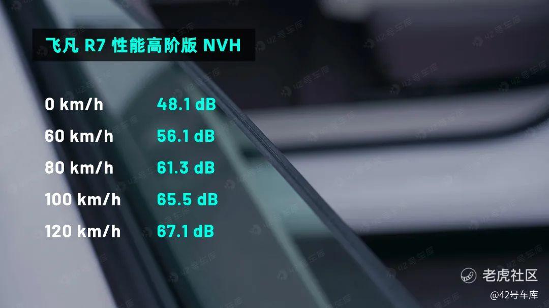 这台飞凡 R7 出厂所选用的轮胎是马牌 PremiumContact 静音轮胎。外加四扇车门都用上了双层夹胶玻璃,即便飞凡 R7 用了四门无框玻璃的情况下,依旧能够提供出同级别中较好的 NVH 表现。不过飞凡 R7 的时速达到 120 km/h 时,A 柱附近仍旧能够听到一定的风声,好在声音并不大。