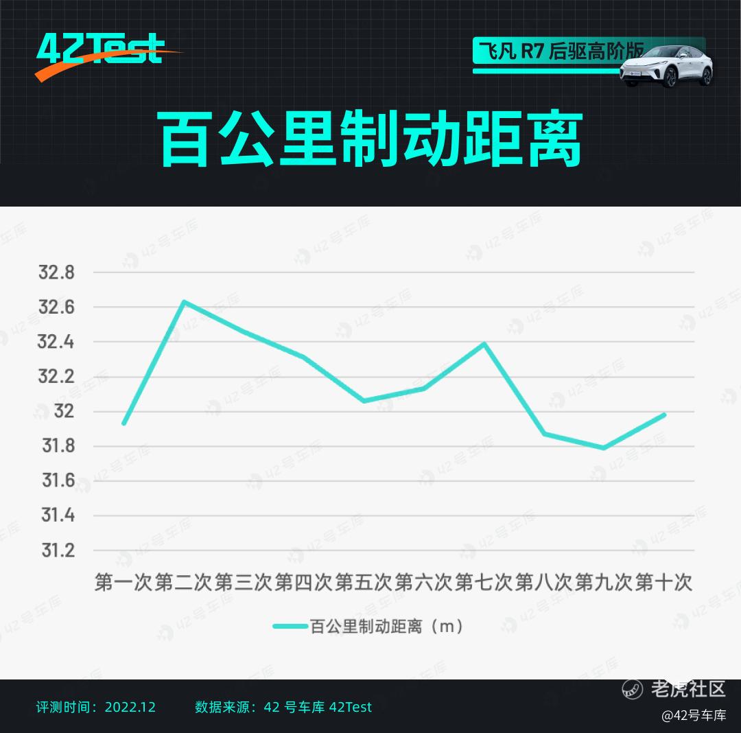 跑得快,也要刹得住。飞凡 R7 的四款车型官方标注的百公里制动距离均为 37.1 米,我们实测了同为 90 kWh 电池组的长续高阶版的百公里制动距离。最短一次为仅为 31.8 米,直接比官方标注的短了 5.3 米,成绩非常优秀。十次连续制动的稳定性也很好,几乎没有热衰减。