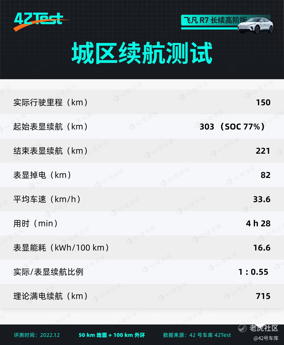 经过 150 km 的城区续航测试后,表显续航里程仅下降了 82 km,折合成的理论城区满电续航里程竟高达 715 km。其主要原因是,测试时剩余 SOC 较多,参照历史能耗的比重较多,当 SOC 较少时才会加大瞬时电耗的比重来调整表显续航里程。按照百公里 16.6 度电的能耗来计算,飞凡 R7 长续高阶版的理论城区续航应该在 500 km 左右。