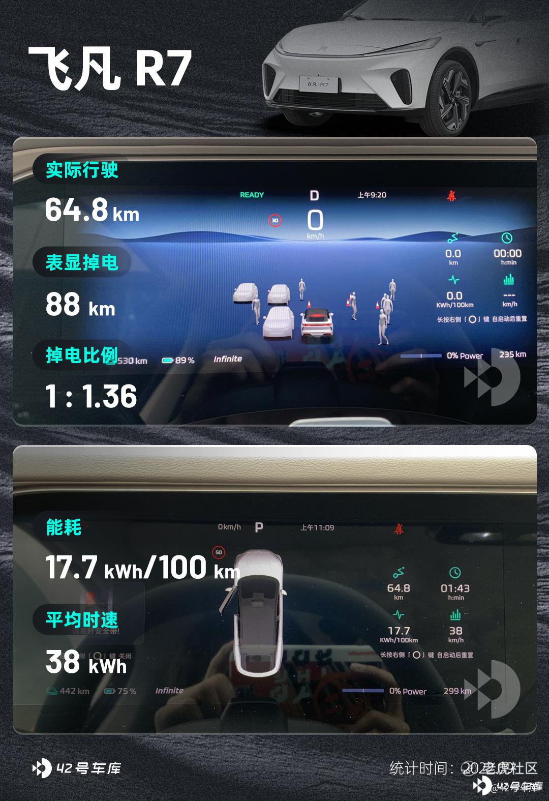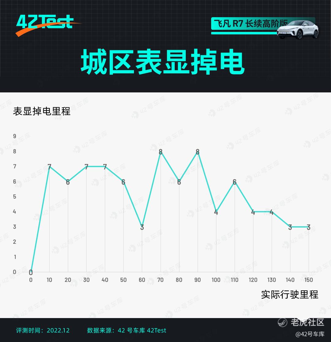 由于前一天测了高速续航,飞凡 R7 的表显续航里程已经记忆了高速工况下的高能耗,因此在测城区续航里程的时候,飞凡 R7 甚至出现了反向虚标的情况,这点同样也在此前测试的大众 ID.6 上出现过。