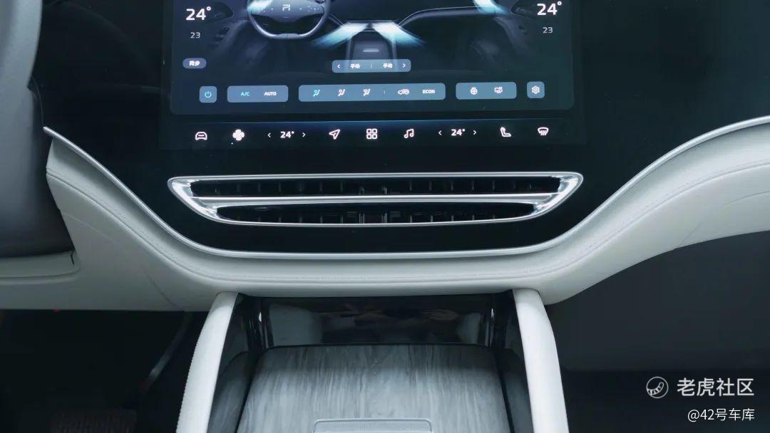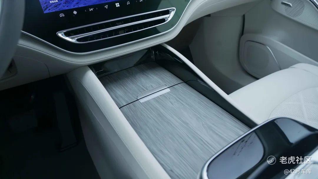 在中控台的下方,飞凡 R7 并没有做类似于竞品们的大挖槽设计,依旧给了一个扶手箱。前盖板的推拉形式,后盖板的翻折形式,阻尼感都不错,是三十万级的车应有的水准。