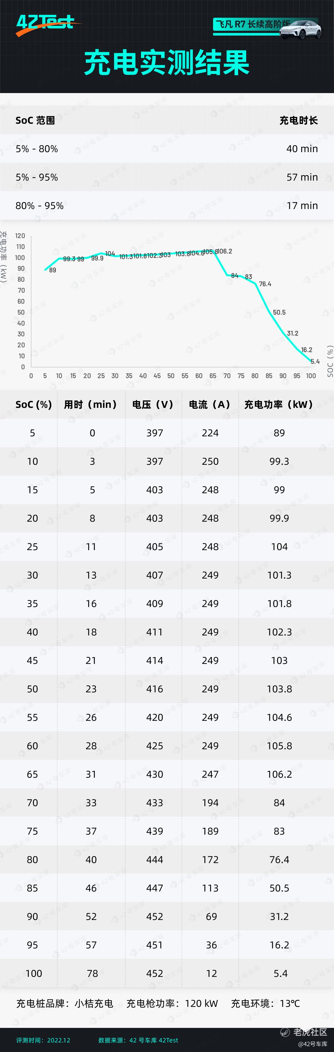 经过实测,飞凡 R7 从 5%—80% 的充电时间为 40 分钟,5%—95% 的时间为 57 分钟。在同一测试条件下,飞凡 R7 的充电速度能排到我们 42Test 充电测试榜单的第二名,仅次于小鹏 G9,说实话这个成绩也挺让我意外的。