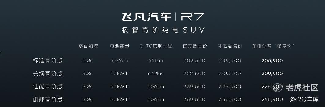 在首批交付的这 1,501 台飞凡 R7 中,平均订单金额超过 32 万元,意味着大家的选择集中在续航高阶版和性能高阶版,也就是大家所称的长续航后驱版以及四驱版。目前在售的飞凡 R7 中,共提供四个配置版本,补贴后售价分别从 28.99 万—35.69 万。