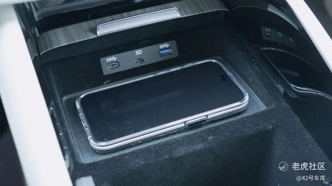 前盖板推开有一个 USB-C 和一个标准的 USB 数据接口,中间还有一个 microSD 卡槽,针对外部的数据传输是比较方便的。接口下方有一个手机无线充电器,放一部 iPhone14 Pro 之后还有一定余量,放下 Pro Max 也没问题。