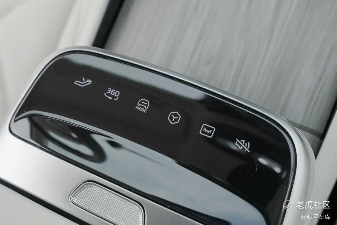 在中央扶手处,飞凡 R7 还按了一个 Touch Bar 操作区域,共有 6 个触控按键,类似于快捷键。可以调节开启全景影像、驾驶模式、音量等等。