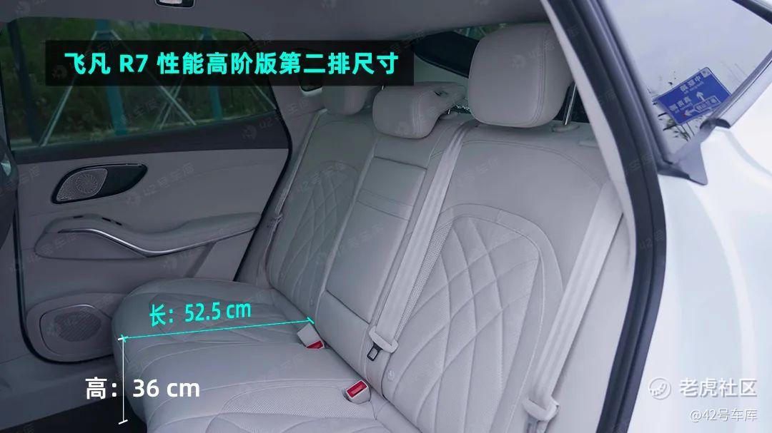 飞凡 R7 的后排坐垫长度及高度与前排几乎相同,因此乘坐舒适性能与前排相仿,提供较好的支撑和承托。后排中间的坐垫较软,但靠背略硬,日常使用场景下能够满足 5 人满载出行的需求。不足之处在于,后排角度无法调节。