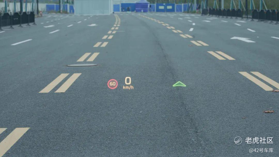 驾驶时,车辆无论是导航信息还是危险提示信息都能够实时根据场景来变化,如果首次接触 AR-HUD 的话会觉得非常科幻。根据官方介绍这块 AR-HUD 投影后相当于一个 7.5 m 处的 70 寸屏幕,甚至可以用来放剧看,只不过色彩显示远不如直接用屏幕看来得好(照片画面有一定拍摄色差)。