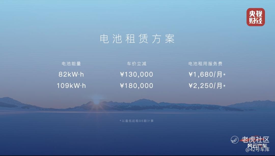 基于电池租赁方案,82 kW·h 的版本车价可减 13 万,电池月租费 1,680 元/月;109 kW·h 版本车价可减 18 万,电池月租费 2,250 元/月: