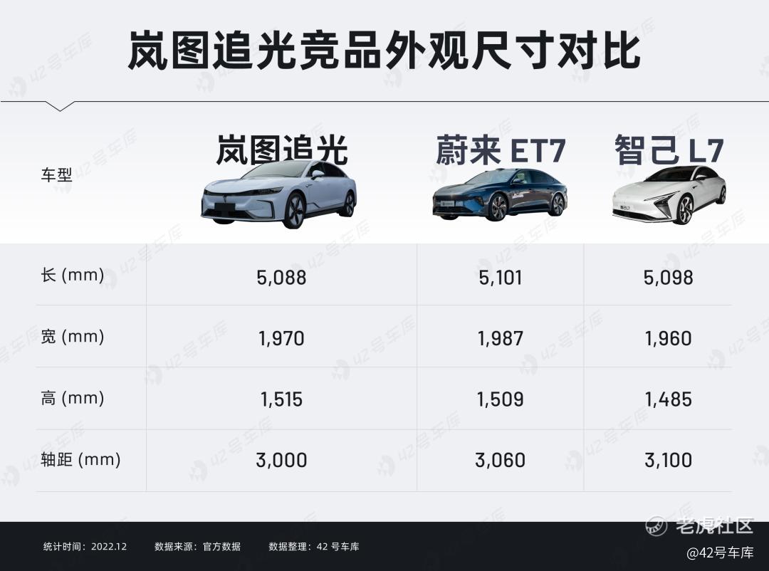 在外观尺寸上,岚图追光和蔚来 ET7、智己 L7 处于同一水平线:
