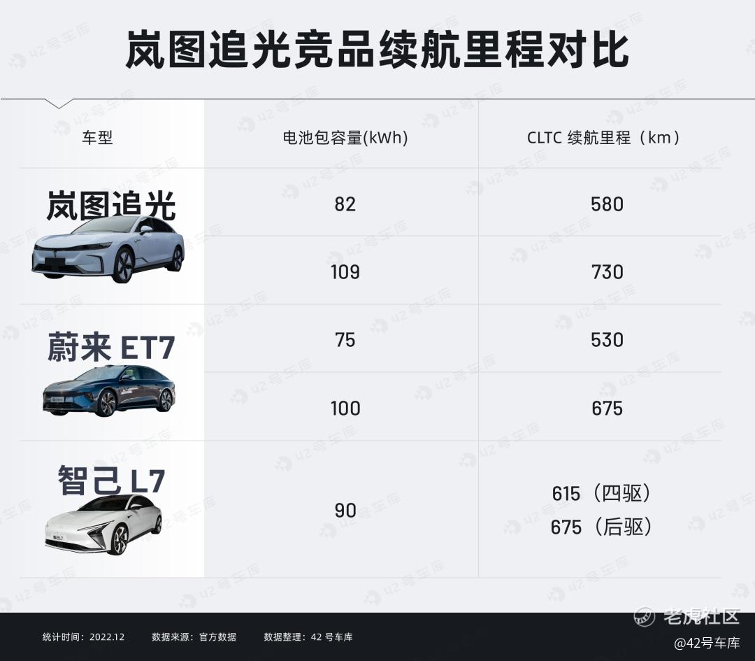 岚图追光的电池包配置则刚好满足上述的两种群体。对于第一种消费者来说,蔚来 ET7 上 75 kW·h、CLTC 530 km 的搭配可能稍显局促,相比之下追光 82 kW·h、CLTC 580 km 的搭配则更加折中。