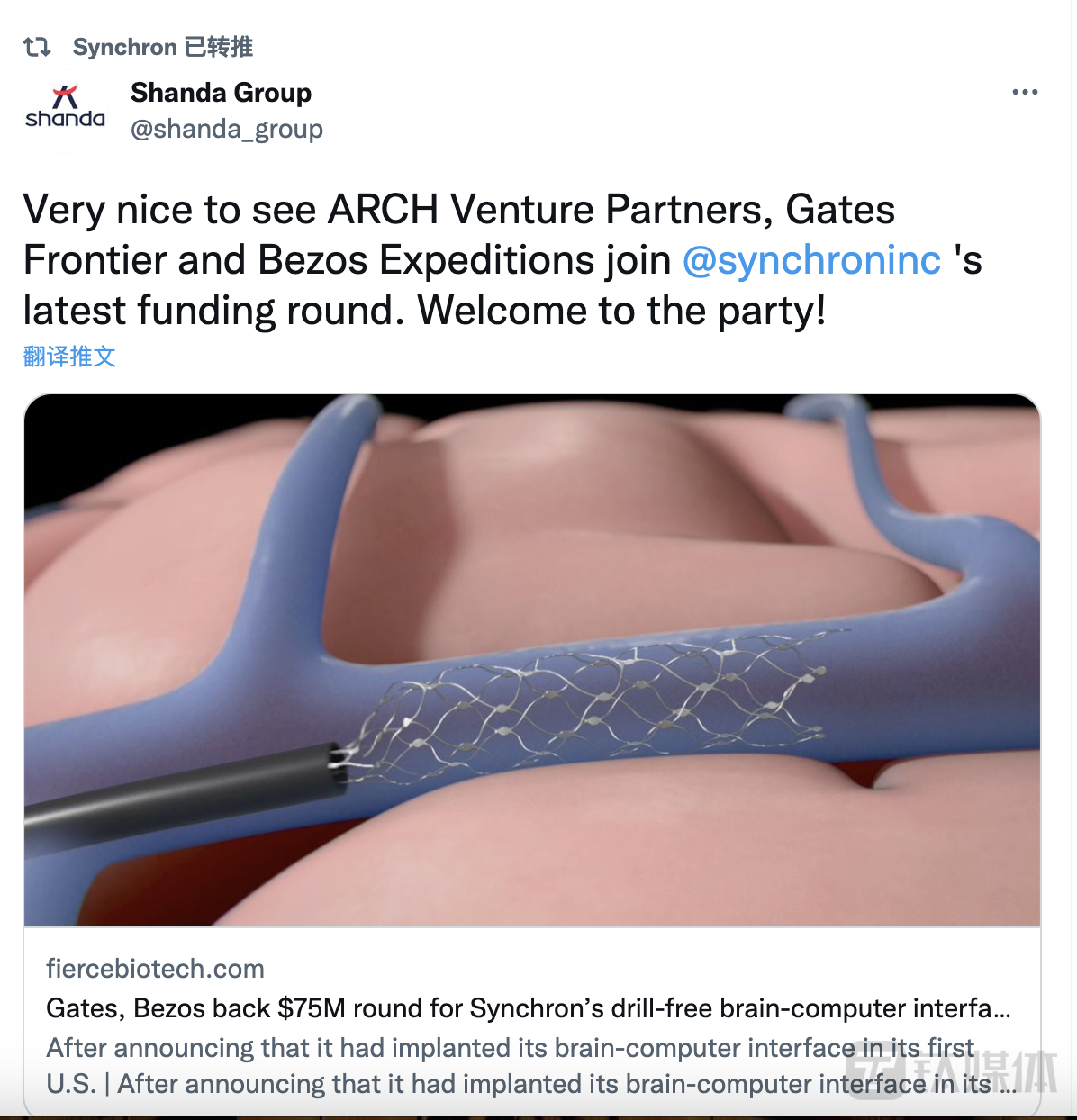 陈天桥的盛大集团(Shanda Group)最早于去年B轮投资的Synchron公司。