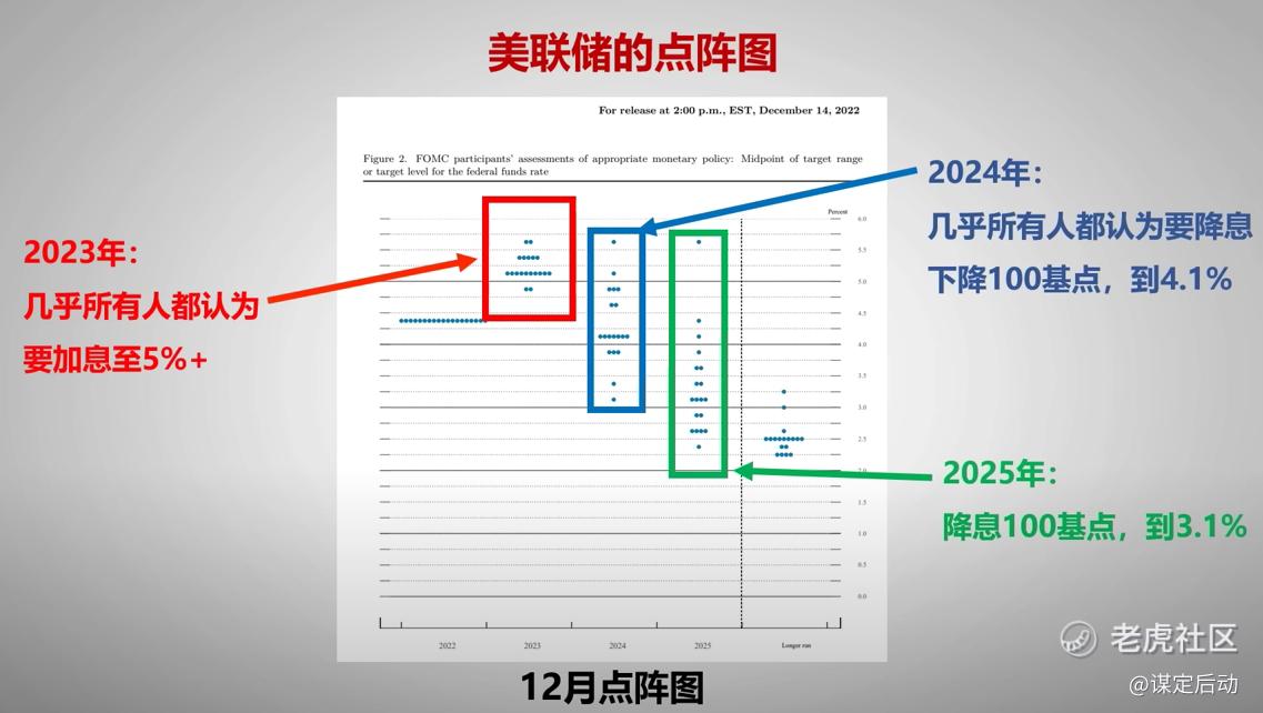 美联储加息50个基点没意外,12月份的这份声明和市场之前的预期是完全一样,没有任何新意。在点阵图上,美联储委员们用投票清晰地表明了2023年不会降息,这就和市场之前憧憬2023年年中或者年底开始降息的情形完全对不上号了。