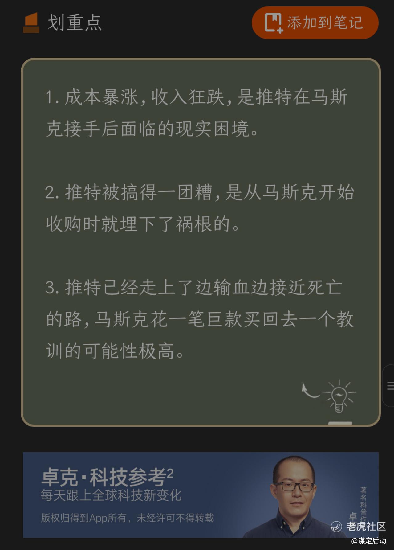 得到App里有一位我很推崇的卓克老师对马斯克折腾推特的事情做了一个详细的分析,看的时候我还有点不以为然,现在看来马斯克大概率上是会把推特搞垮的。作为特斯拉的股东,我希望推特尽快倒闭关门,这样马老板折腾完了,就会去继续搞他应该搞的特斯拉,那时候就是特斯拉的重大利好吧[笑哭]