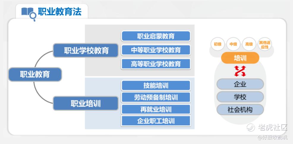 从2021年下半年起,多项支持职业教育发展的政策出台,意在积极鼓励职业教育发展,扫除民办高校/职教板块发展的不确定性,鼓励上市公司、行业龙头参与到职业教育、职业培训的业务。并且在今年5月,新修订的《职业教育法》正式实施,明确职业教育和普通教育地位同等重要,包含“职业学校教育和职业教育培训”两种形式,国家鼓励、指导、支持企业和其他社会力量举办职业学校,鼓励金融机构通过提供金融服务支援发展职业教育。