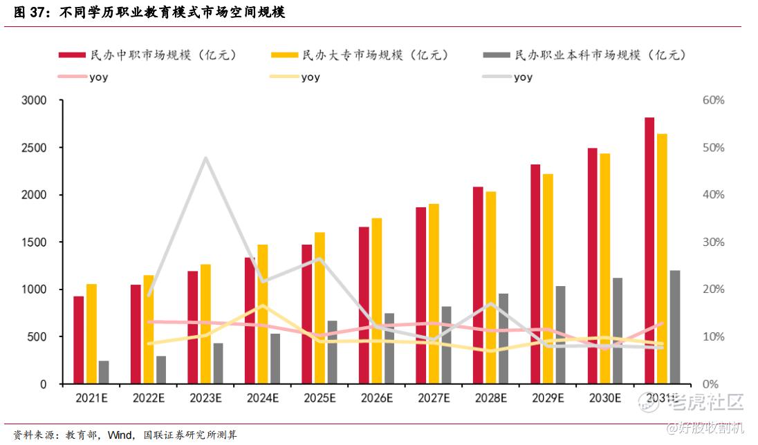 根据国联证券的测算,高质量教育的举办者更能够应对未来出生人口下降带来的需求收缩,由民办中职、大专、职业本科组成的民办学历职业教育市场规模到2031年有望增长至6600亿元,未来十年有3倍增长空间。非学历职业教育市场有望量价齐升,成为行业的重要驱动力。为当前头部优质公司的估值与其业绩的成长性、确定性、长期发展机遇呈现显著错配。