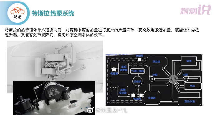 二是动力电池系统、驱动系统(包括电机和传统系统)以及功率电子产生的余热。特斯拉的热管理依靠八通换向阀,对上面两种来源的热量进行复杂的热量汲取,更高效地搬运热量,既能让车内极速升温,又能有效节能降耗。提高热泵空调总体的效率。