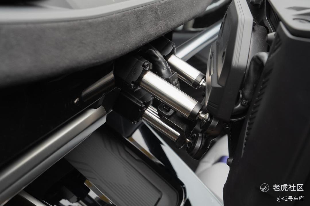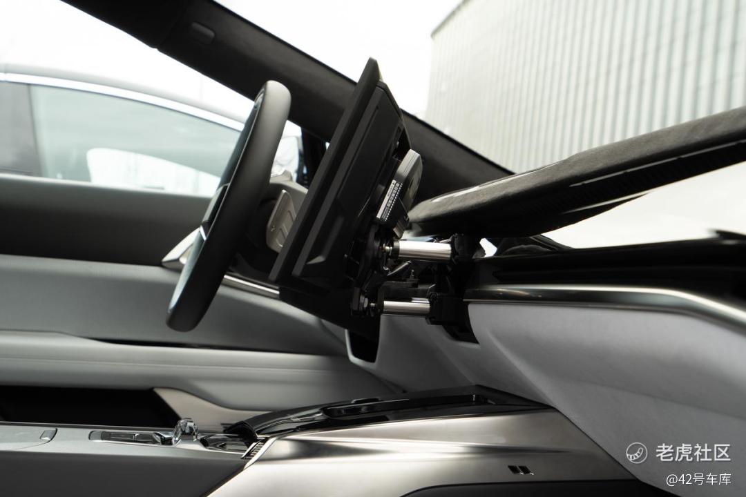 设计师给这块屏做了一个可以在 4 个自由度上调节的支架结构。这个基座由三根丝杠电推杆和一个可使屏幕横竖旋转的电机共同构成,从侧面看上去会感觉非常有机械美感。而且这样的结构设计也给了它非常灵活的调节能力,不仅可以做到朝向的改变,还可以真的像机器人一样对开了的车门进行指向并显示画面配合声音问好。某种程度上有点像蔚来的 Nomi,能够提供更多人机交互上的感知。
