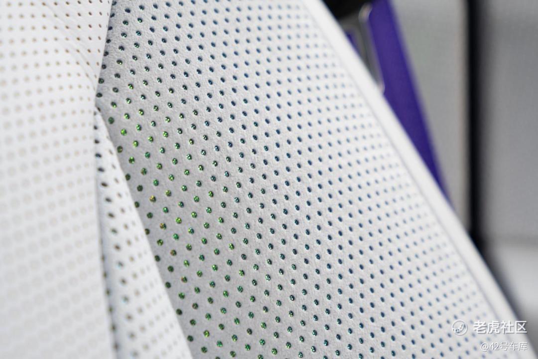 但是座椅上有一个细节比较让我觉得非常亮眼,在打孔麂皮的下面还有一层绿色的反射层,在日间较亮的环境下会显得座椅很有层次感。类似的彩色反射材质还出现在了方向盘上,方向盘的内侧采用了 Nappa 皮喷涂特殊涂层的工艺,使得视觉观感也非常的奇特。