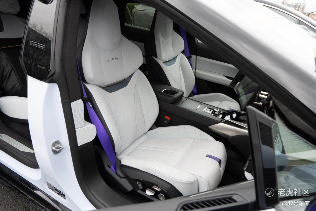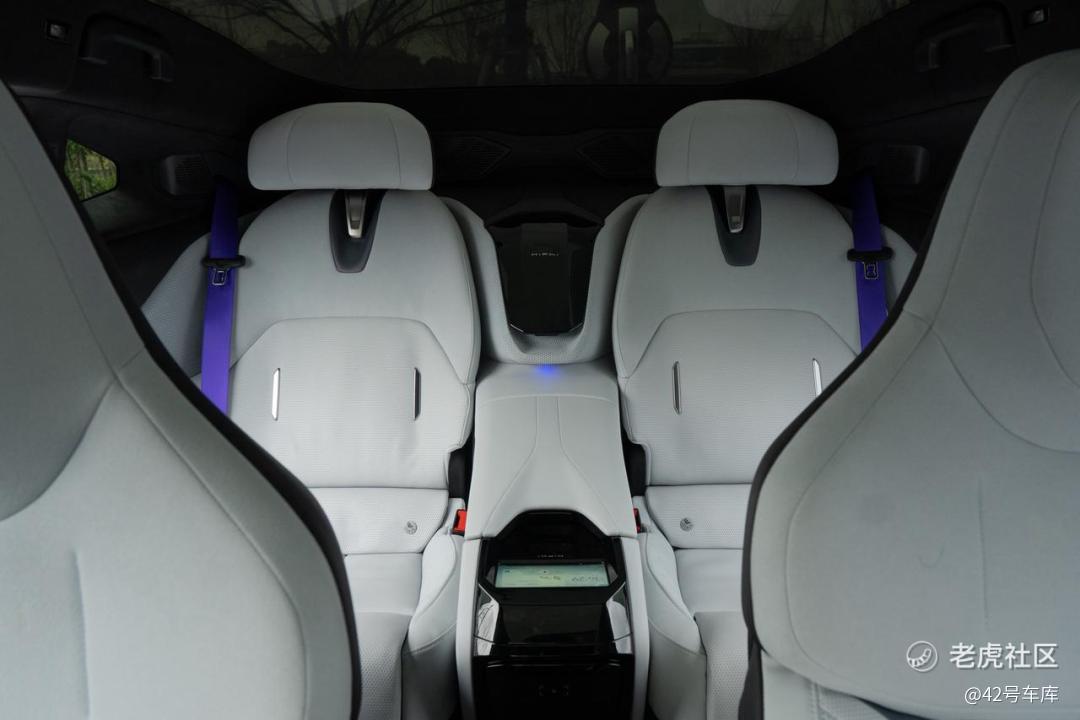 HiPhi Z 的座椅采用了类似赛车桶椅的造型,表面采用了仿麂皮的材质,整体的质感非常好,并且 4 座版本前后排都带座椅通风和加热。乘坐感受算是比较舒适的类型,比视觉上看起来更贴合一些,但还是属于略微偏硬的填充。