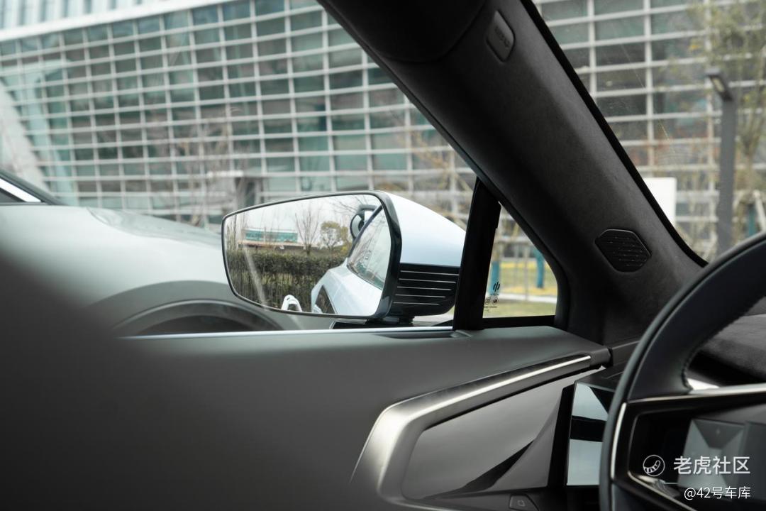 一个不吐不快的设计亮点是,HiPhi Z 采用了无框式后视镜的设计,这也是我第一次在极星以外的车型上看到这个设计。无框设计不仅能让整个后视镜的尺寸变小,也能够让后视镜在当前大小下有更大的镜面尺寸。