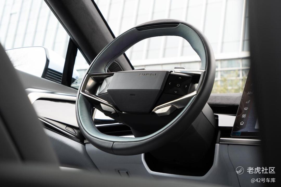 内饰的设计其实应该说和整车外观的设计风格是统一的,这一点其实在别的车上很难看到。因为这个点在 HiPhi Z 身上的具体体现是凌厉的线条和块状的设计元素,在车内各个部位的覆盖面上都能看到这些设计,尤其是方向盘。