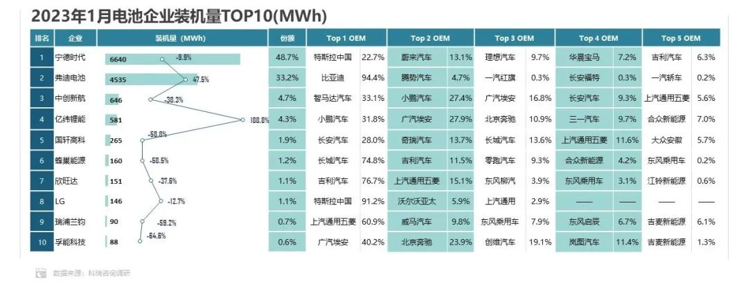 2023年1月,多数企业出现销量同比下降现象,宁德时代实现48.7%的市场份额,依然保持领导地位。