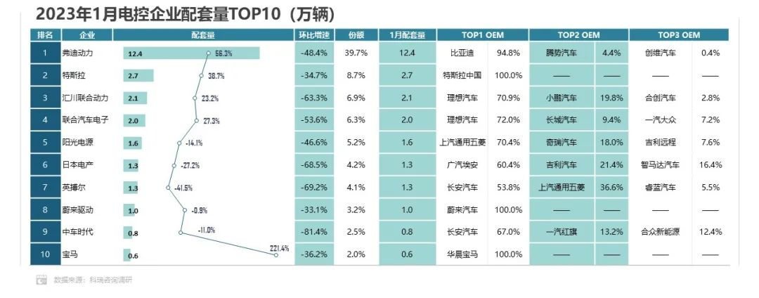 2023年1月,Top10电控配套企业合计占比82.8%,行业集中度环比上升14.7%。