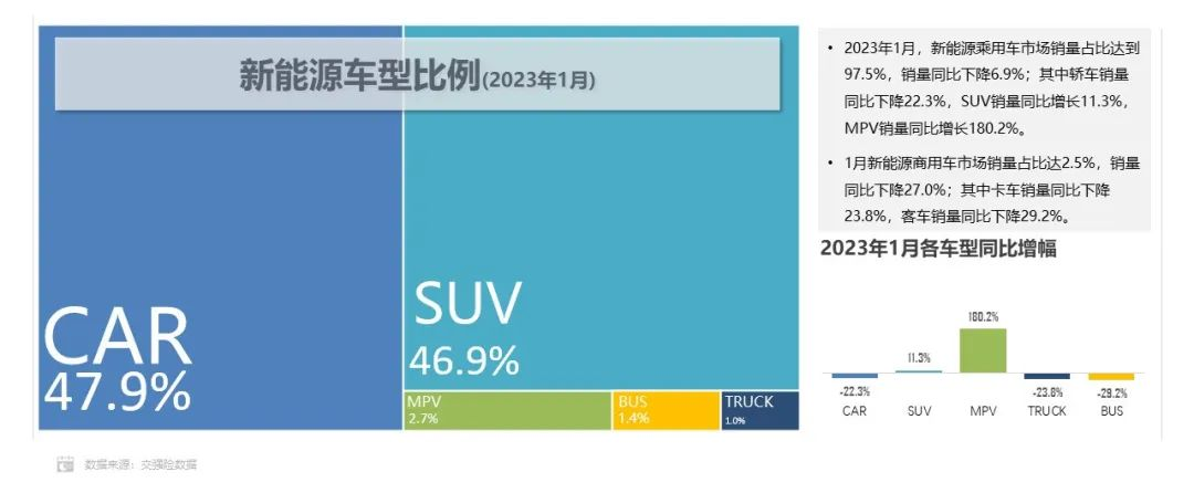 - 2023年1月,轿车占比47.9%,比去年同期低9.1个百分点;SUV、MPV份额分别提高7.9和1.8个百分点;客车、卡车份额微降0.4和0.2个百分点。