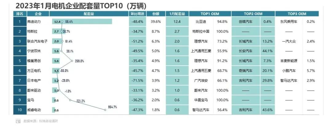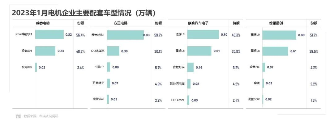 2023年1月新能源汽车市场销量相比同期有所收缩,但受多电机车型销量大幅度增长影响,电机配套量下滑幅度不大。