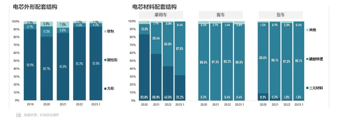 电芯材料方面,乘用车磷酸铁锂电芯配套量占比大幅提升,相比同期增加23.8%,这符合新能源车上量后的市场趋势表现。客车、卡车市场依旧保持磷酸铁锂电芯高额占比的市场状态。