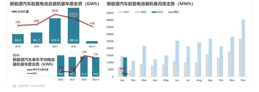 2023年1月,新能源汽车动力电池装机量13.6GWh,同比下降6.5%。