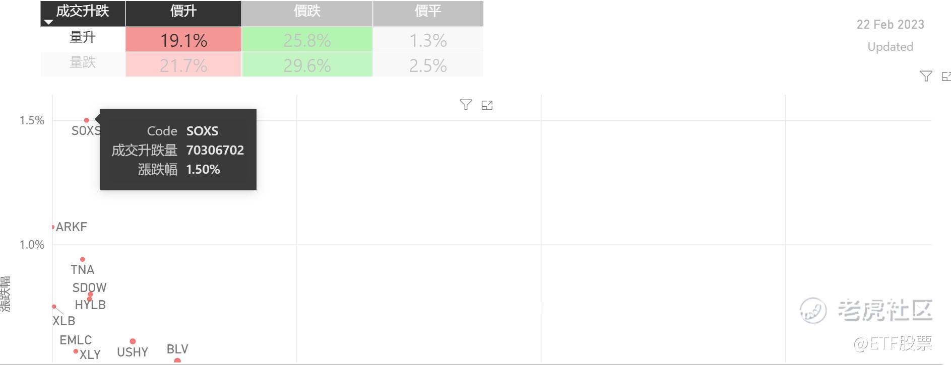如果考虑部署短期追升ETF,可以考虑以下品种,比如 $三倍做空半导体ETF-Direxion Daily(SOXS)$ 、ARKF以及TNA三只ETF都分别呈现价量齐升的型态,三者分别录得1.50%、1.07%以及0.94%的升幅。