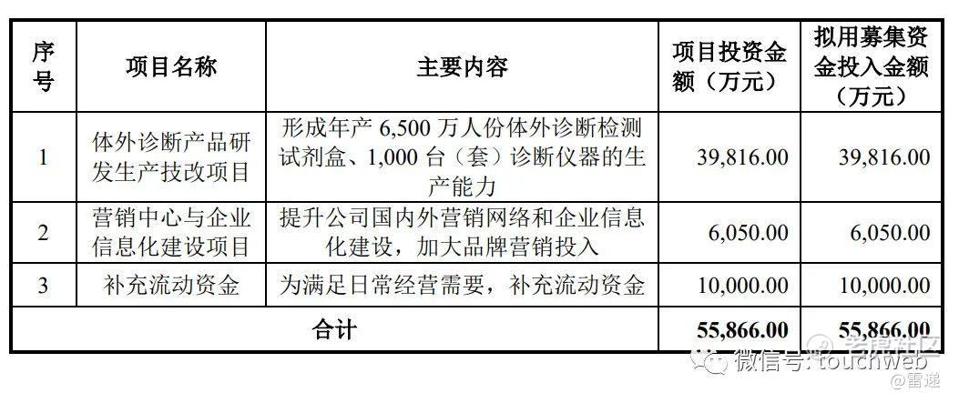 其中,3.98亿元用于体外诊断产品研发生产技改项目;6050万元用于营销中心与企业信息化建设项目,1亿元用于补充流动资金。