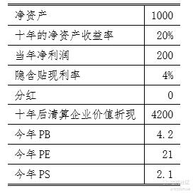 我们初步算出来一个值,就是在4%的折现利率情况下(隐含投资收益率4%),该企业对应的现在价值是4200元,也就是4.2倍的PB,在这个情况下对应的当年PE是21倍PE,2.1倍PS,如果每年有分红那么就要引入到DCF和DDM模型中。