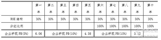 从这个图形我们可以看到如果隐含每年15%的投资收益,ROE能维持十年在30%左右,对应现在的PB倍数仅仅是3.4倍,这个数值是不是让人咋舌?当看到这个数字的时候,让那些PB倍数高过10倍以上的企业情何以堪,例如在第二章我们提到的某疫苗企业最高PB曾经达到过45倍。
