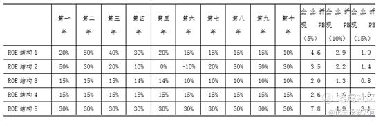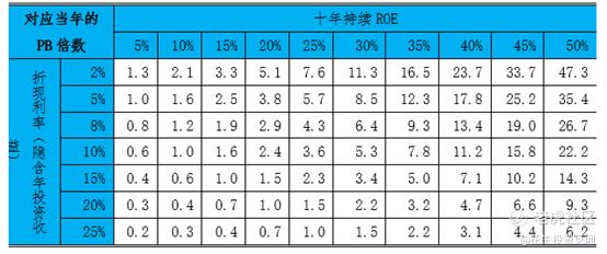 如下表我们做了各种的测算,以不同持续的ROE和不同的折现利率(隐含年度收益率)估算的应该对应的PB倍数。